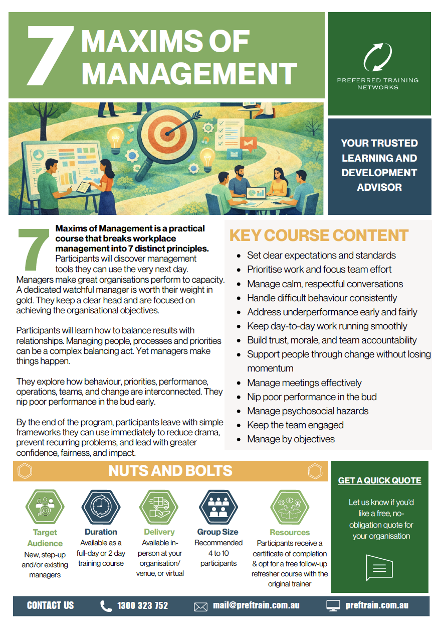 The 7 Maxims of Management course by Preferred Training Networks breaks workplace management into seven clear and practical principles. Participants walk away with simple frameworks they can use immediately to reduce drama, prevent recurring issues, and manage with confidence and fairness.