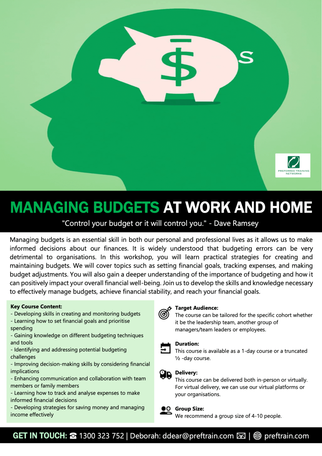 Target Audience: This course can be tailored for the specific cohort, whether it be the leadership team, another group of managers/team leaders or employees.
