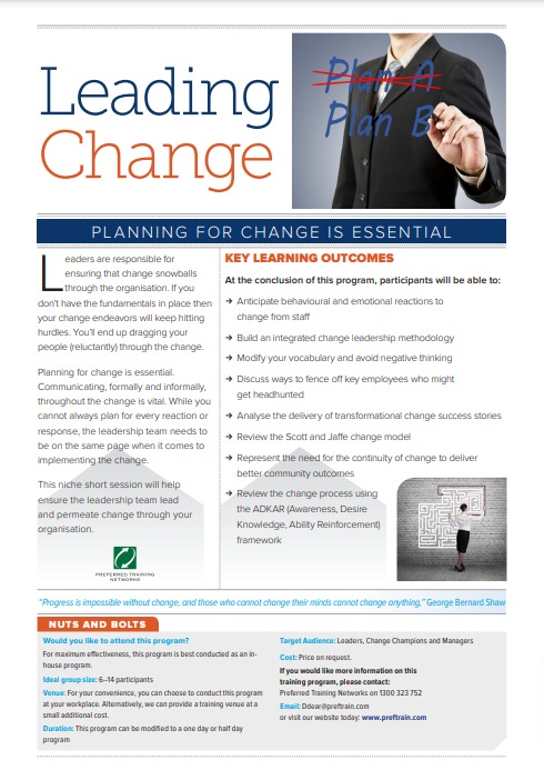 Duration: This program can be modified to a one day or half day program Target Audience: Leaders, Change Champions and Managers