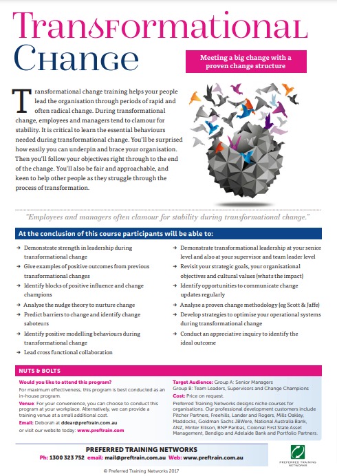It is critical to learn the essential behaviours needed during transformational change. You’ll be surprised how easily you can underpin and brace your organisation. Then you’ll follow your objectives right through to the end of the change. You’ll also be fair and approachable, and keen to help other people as they struggle through the process of transformation.