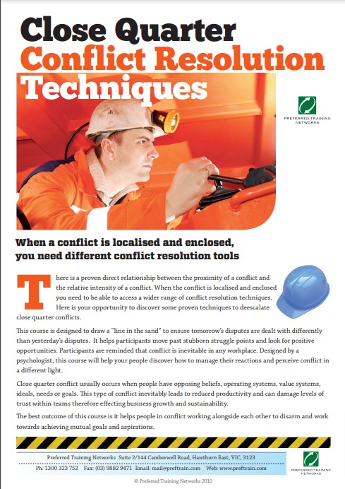 Our de-escalating conflict workshop includes strategies such as building rapport, analysing body language, utilising positional bargaining, and more. We encourage you to contact our team for more information. Yes it’s an Australian training course.