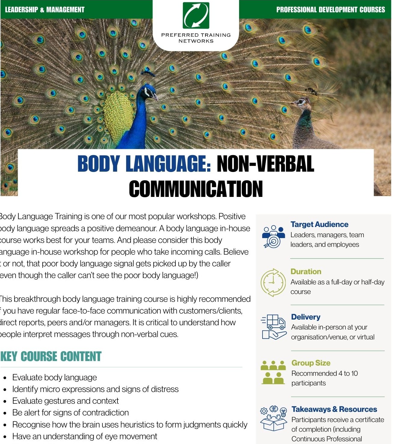 Are you ready for body language training? If you hear any of these questions then it’s probably prime time to run this course. How do I read other people’s non-verbal communication? How do I spot buying signals from customers? What does my body language portray? Think of Preferred Training Networks when you are looking out for courses on body language or body language training. Additionally, our team can assist you with confidence building courses, workplace behaviour training, business presentation training, soft skills training for employees and more. Who can benefit from Body Language Training? For maximum effectiveness, this program is best conducted as an in-house program.
