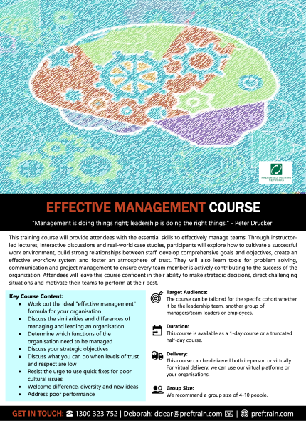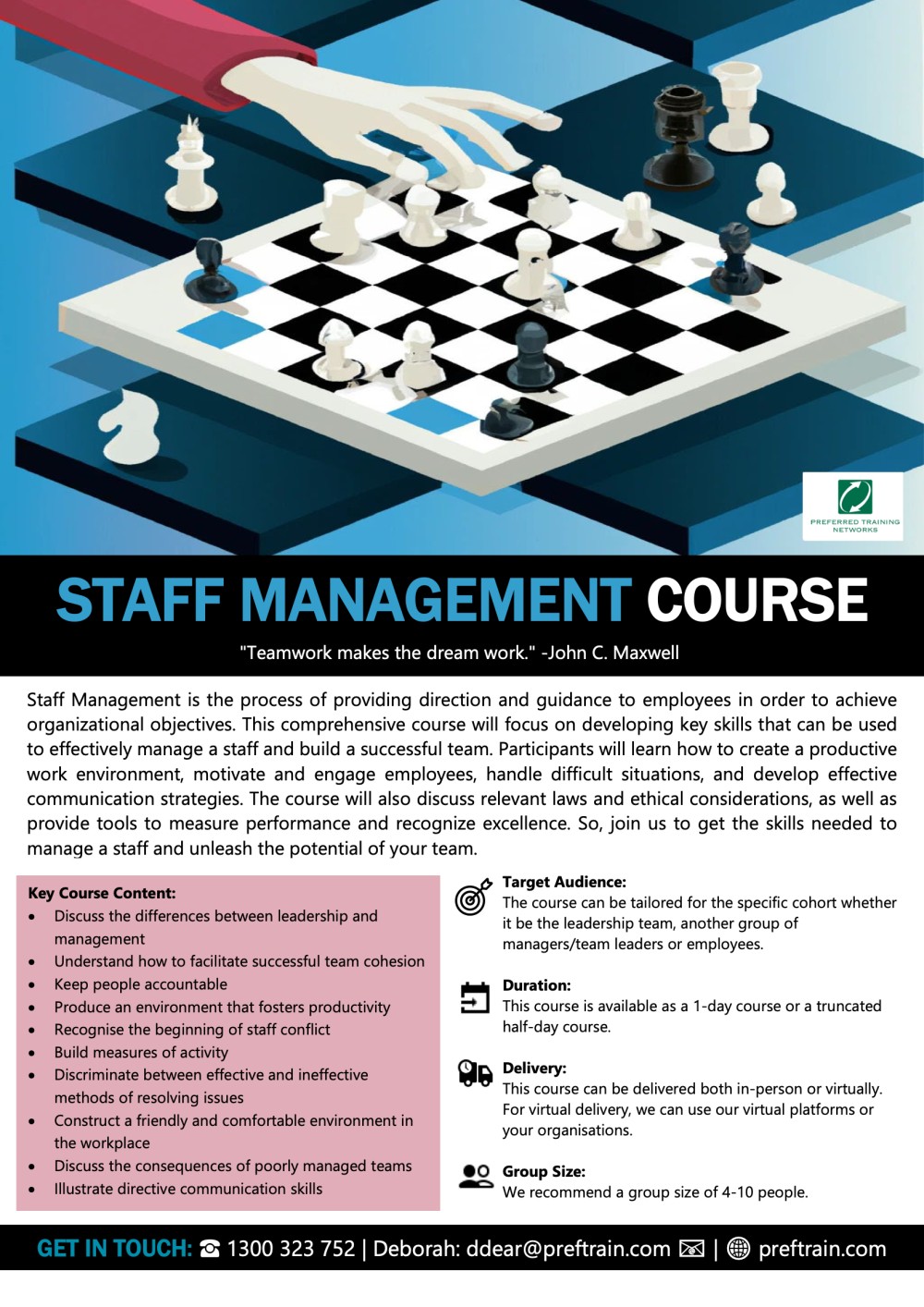 Participants will learn how to create a productive work environment, motivate and engage employees, handle challenging situations, and develop effective communication strategies. The course will also discuss relevant laws and ethical considerations, as well as provide tools to measure performance and recognise excellence. Join us to acquire the skills needed to manage a team.