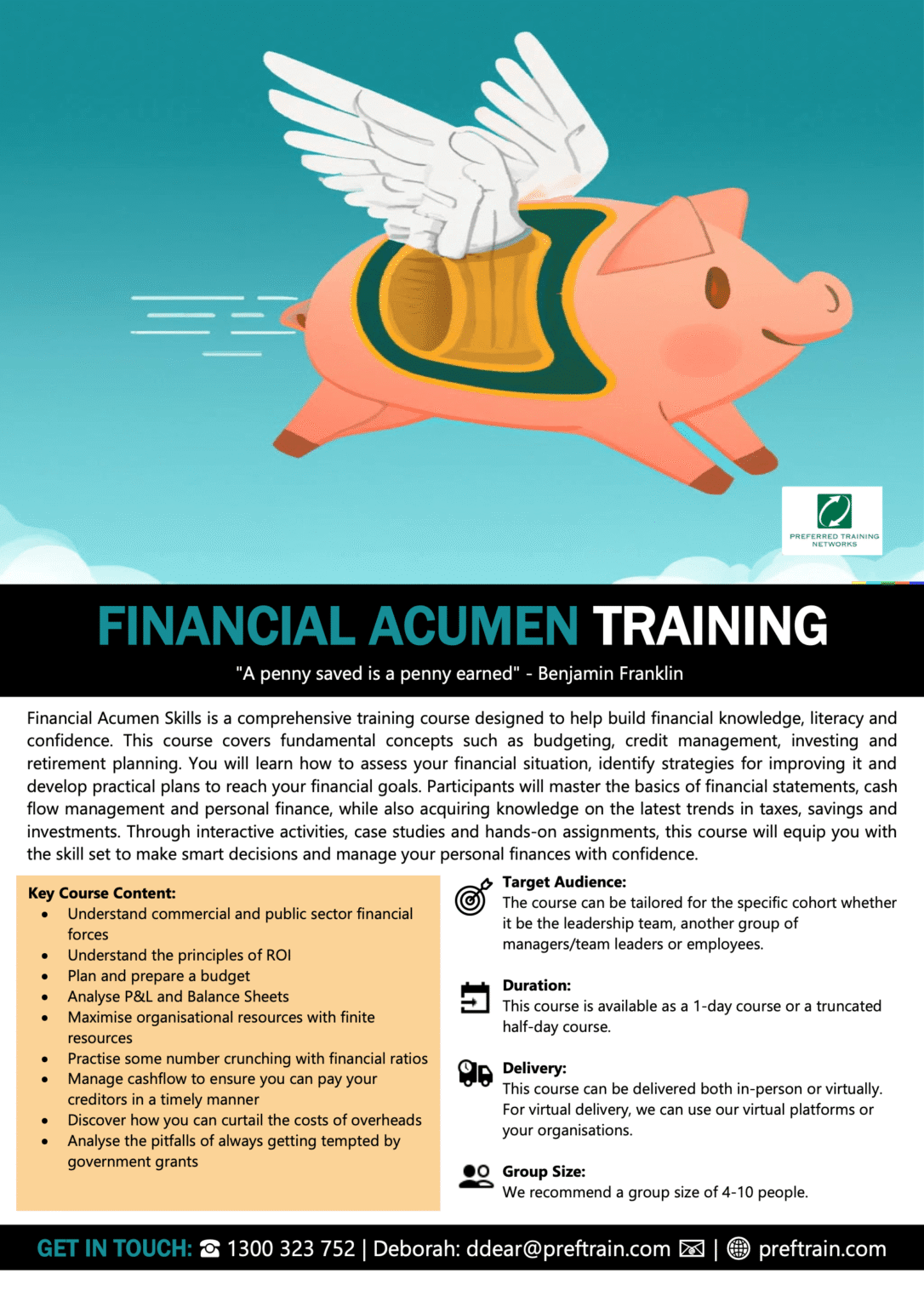 Venue: For your convenience, you can choose to conduct this program at your business premises. Alternatively, we can provide a training venue at a small additional cost. For virtual delivery, we can use our virtual platforms or those of your organisation.
