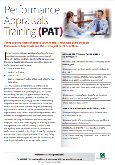 In Part One (PAT1) the management group will be trained in conducting best practice appraisals in the morning session. In Part Two (PAT2), general staff will learn the best practice in participating, asking questions and maximising the performance appraisal in the afternoon. It’s a win/win course. Both parties win by conducting and participating in performance appraisals that not only fulfil and meet the organisation’s expectations but provide the participants with the skills for making performance appraisals more relevant. Instead of dreading performance appraisals, they will simply be seen as part of the ongoing relationship between managers and their staff and an easy system to carry out regularly. Both parties will be able to connect the performance appraisal to the bigger picture. By completing the appraisals more diligently (instead of randomly filling in boxes) staff and managers will have the opportunity for meaningful and realistic performance discussions.