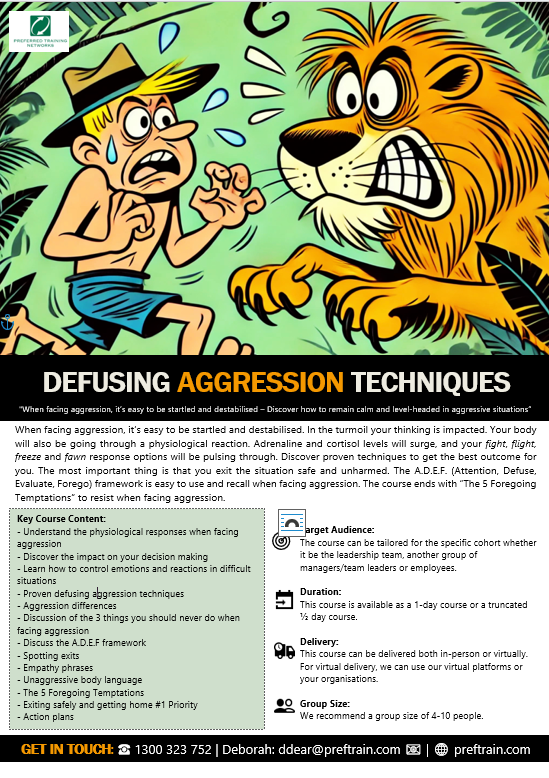 Participants leave with an actionable plan for managing workplace aggression and a reinforced understanding of the importance of prioritising their safety above all.