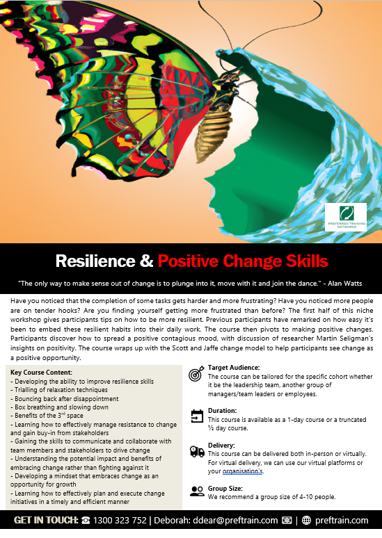 Participants will learn how to fortify their resilience and approach tasks with a fresh, positive outlook. The workshop covers techniques for handling stress, embracing change and fostering a supportive environment. Drawing from Martin Seligman’s research on positivity and the Scott and Jaffe change model, participants gain tools to drive meaningful change in the workplace. By the end, they will have a toolkit of strategies for resilience and a blueprint for creating a constructive, proactive approach to change.