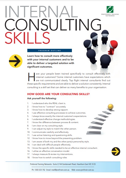 Have your people been trained specifically to consult effectively with internal customers? Some internal customers have expectations which are not communicated clearly. Top flight internal consultants find out these specific requirements and are able to deliver a solution consistently. Internal consulting is a skill set that can deliver so many benefits to your organisation.