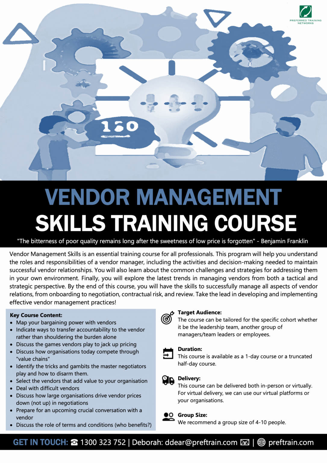 A. Our vendor management training is typically delivered as a one-day interactive workshop. However, it can be customised to a half-day, multiple sessions, or as part of a larger leadership or procurement development program.