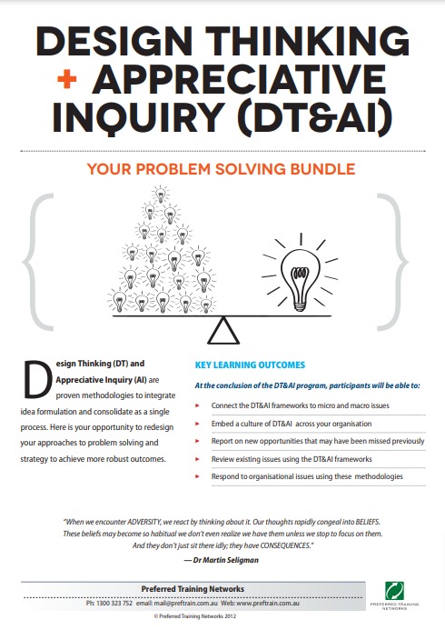 Surely it’s time to get past the SWOT analysis that can often leave people dejected, feeling there is a huge burden of tasks to carry. The SWOT reminds everyone of the organisation’s weaknesses whereas this combined approach harnesses the positive power of your organisation. This course synergises these two proven innovative problem solving methodologies. You’ll be surprised at the depth of creative solutions derived from this integrated approach. The workshop energises people because it works from the end goal and avoids the paralysis by analysis dynamic. The creative thinking in action quickly engages people and generates animated discussion and participation. Everyone leaves in a positive frame of mind and this positivity filters through the senior leadership team and the organisation.