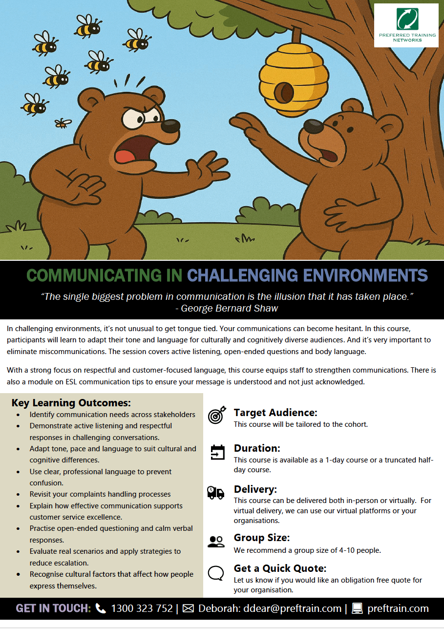 Communicating in Challenging Environments equips participants to manage difficult conversations, listen actively, and tailor their messaging to different audiences. From frontline customer service to internal team interactions, your people will gain the skills to handle challenging communication moments with professionalism and care.