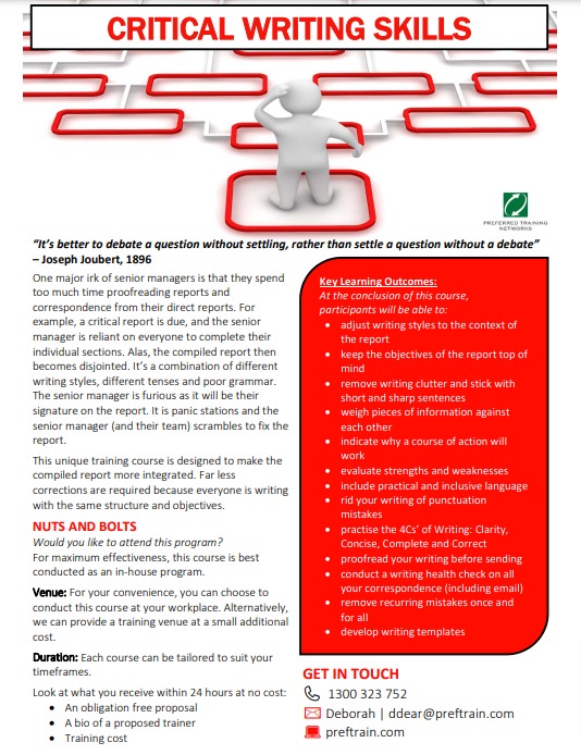 Critical writing training courses help people understand the importance of their writing. Participants are reminded that the reader is forming opinions and making decisions as they read. It’s easy to get caught up with the technicalities of the information and forget to keep the reader top of mind. Have you ever read an important report where you were losing the flow. It was patchy understanding rather than structured understanding.
