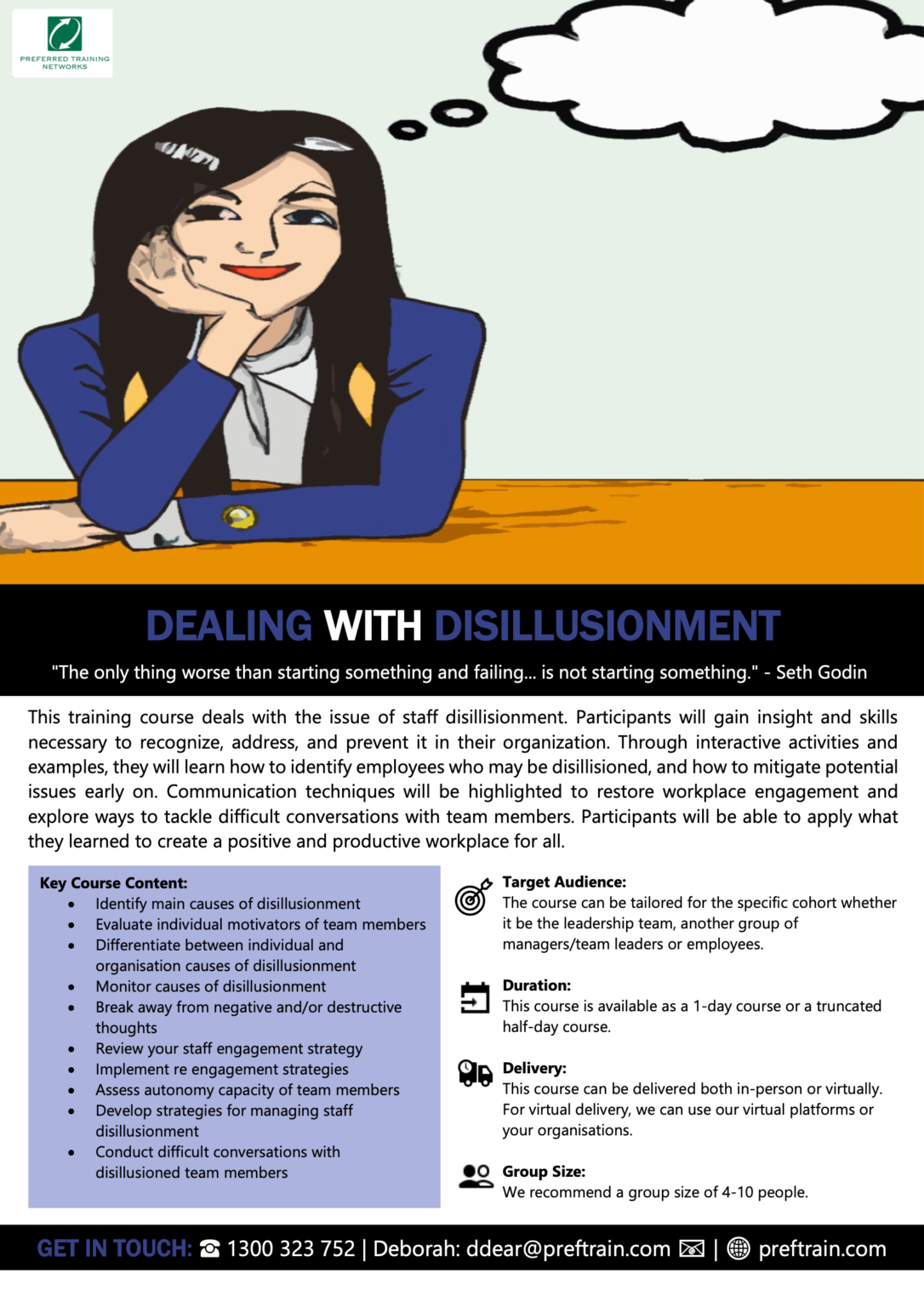 If you would like more information on this training program, please contact: Preferred Training Networks on 1300 323 752Â Email: [email protected]