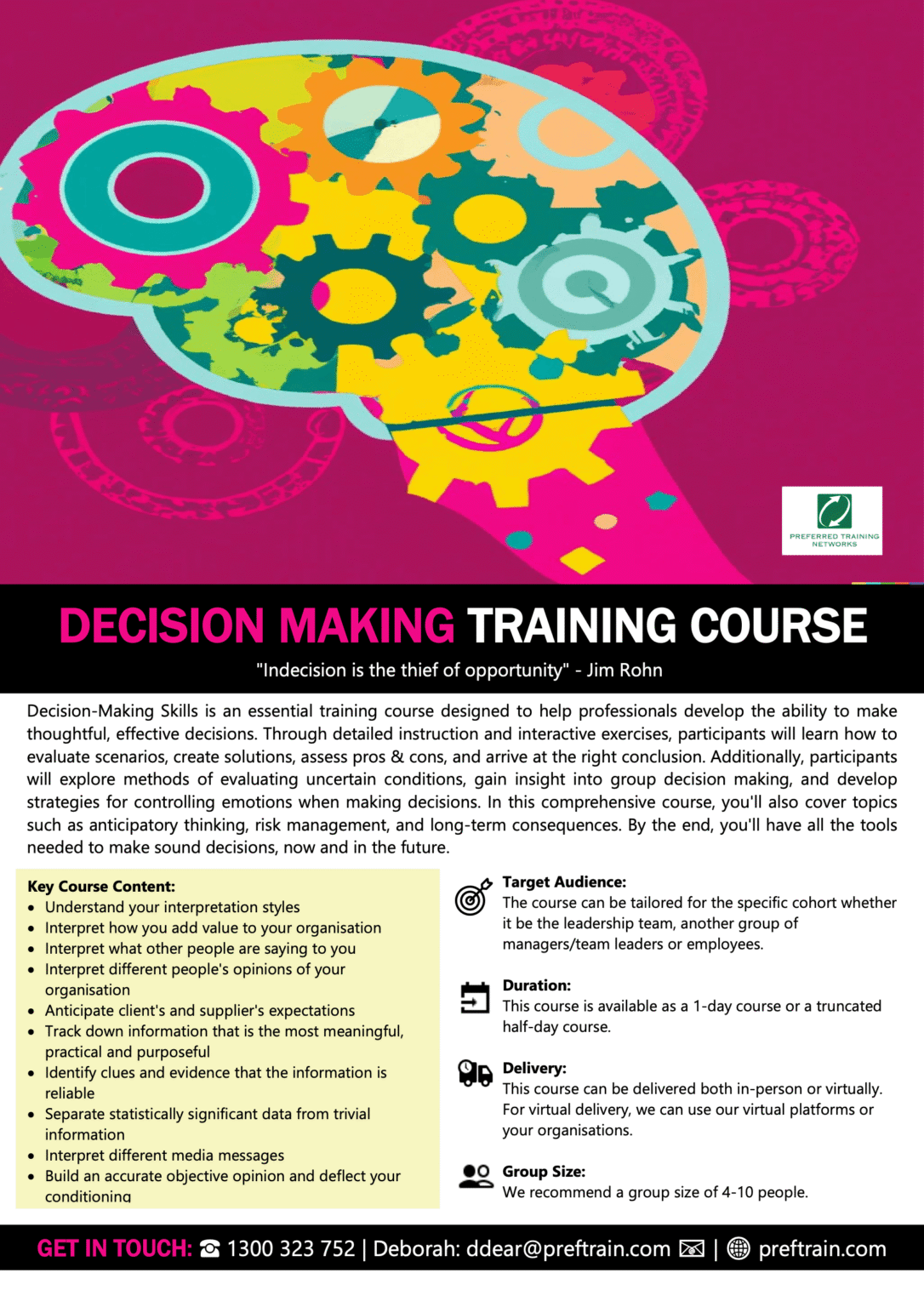 If you would like more information on this training program, please contact: Deborah Dear on 1300 323 752 or email: [email protected] or contact us online today.