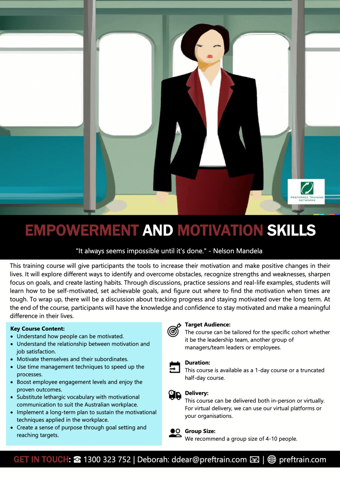 If you would like more information on this training program, please contact: Deborah Dear on 1300 323 752 or email: [email protected] or contact us online today.