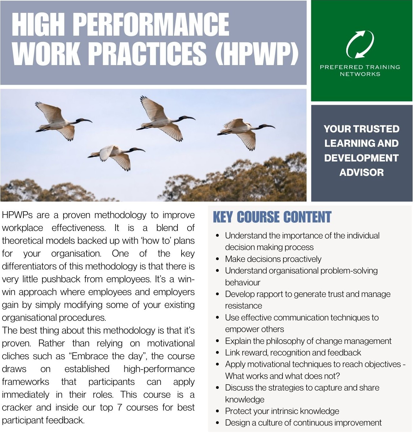 HPWPs are a proven methodology to improve workplace effectiveness. It is a blend of theoretical models backed up with ‘how to’ plans for your organisation. One of the key differentiators of this methodology is that there is very little pushback from employees. It’s a win-win approach where employees and employers gain by simply modifying some of your existing organisational procedures.