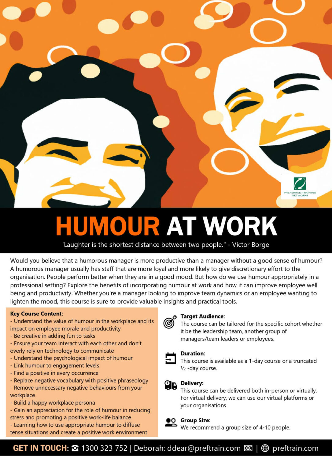 Would you believe that a humorous manager is more productive than a manager without a good sense of humour? A humorous manager usually has staff that are more loyal and more likely to give discretionary effort to the organisation. People perform better when they are in a good mood. This course was designed to teach people a framework of how to be humorous in the workplace. The program recognises that not everybody wants to be humorous. However, it is still possible to work in an environment of humour if you have a working knowledge of how to promote humour. How humorous is your workplace?
