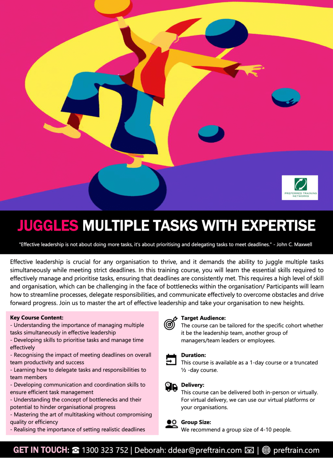 Multi Tasking Training Courses are recommended for busy people. If you look at any juggler, you’ll see they have a capacity point. Beyond the capacity level, they will fail and drop a ball. Exactly the same in the workplace. If you’ve got too many balls, you’ll drop one. This course looks at the impact of micromanagement and delegation. In the modern workplace, you have to be able to juggle some balls at the same time. Working sequentially from task to task does not work in many roles.