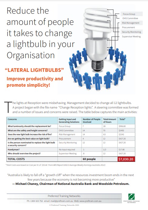 Lateral Lightbulbs Training workshop showcases ineffectiveness in organisations. The cost of changing a lightbulb before 2020 was $7,030, so today it would be maybe $13,000! Productivity levels in Australia are falling though the floor. If we keep making things more complex, then we’ll keep falling down the global GDP ladder.