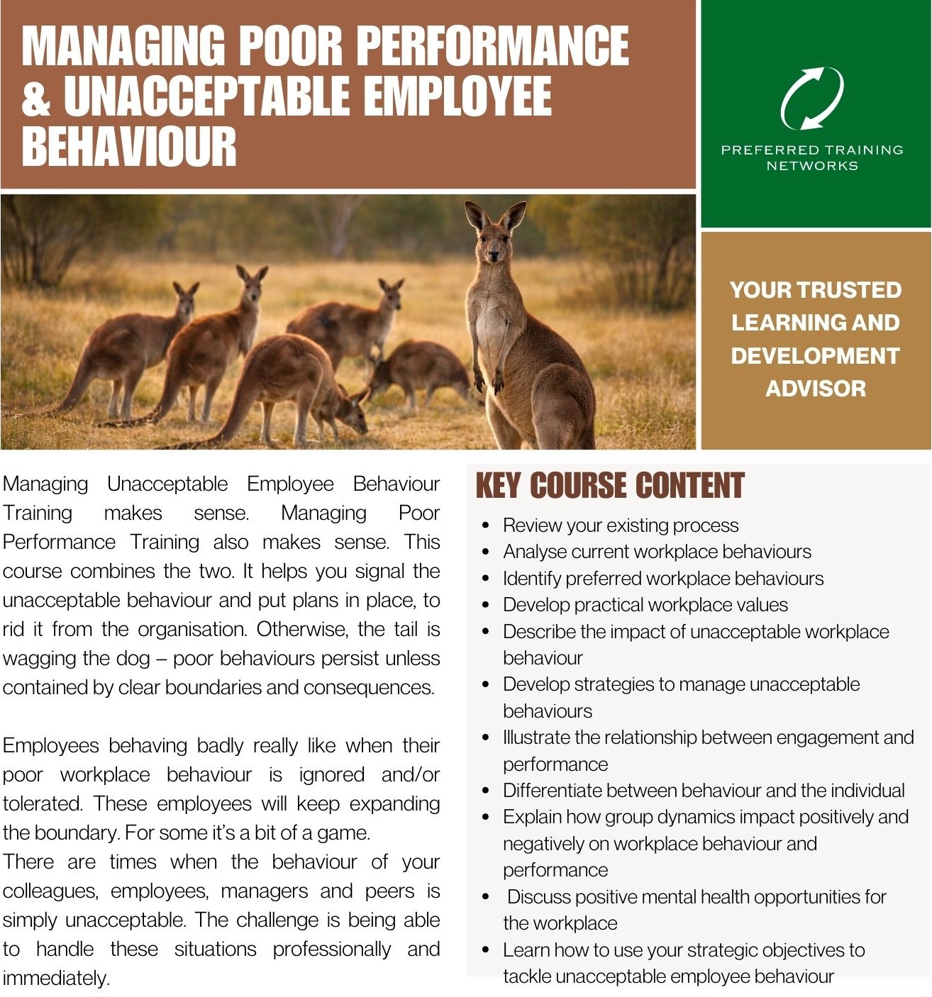 Managing Unacceptable Employee Behaviour Training makes sense. Managing Poor Performance Training also makes sense. This course combines the two. It helps you signal the unacceptable behaviour and put plans in place, to rid it from the organisation. Otherwise, the tail is wagging the dog – poor behaviours persist unless contained by clear boundaries and consequences.
