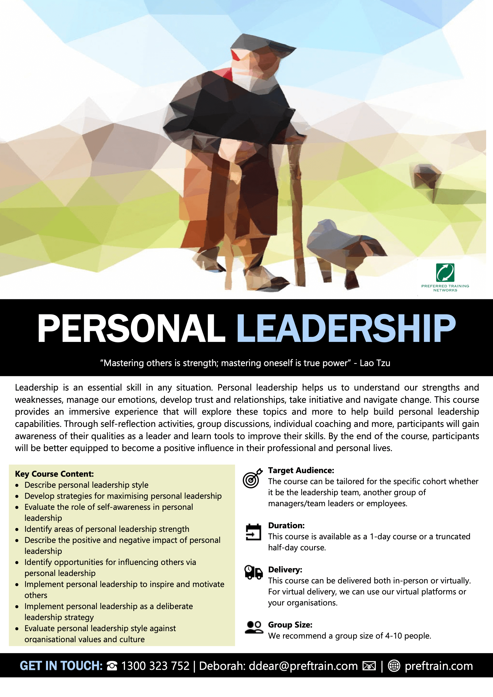 If you would like more information on this training program, please contact: Preferred Training Networks on 1300 323 752 Email:Deborah at [email protected]