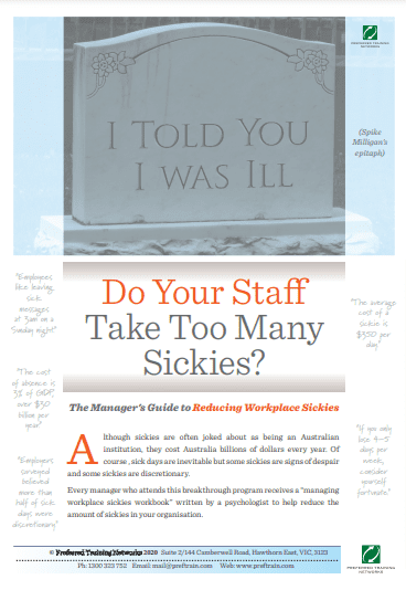 Every manager who attends this breakthrough program receives a “managing workplace sickies workbook” written by a psychologist to help reduce the amount of sickies in your organisation.