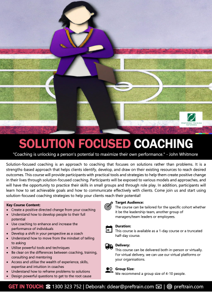 Solution-focused coaching is an approach to coaching that focuses on solutions rather than problems. It is a strengths-based approach that helps clients identify, develop, and draw on their existing resources to reach desired outcomes. This in-house coaching course will provide participants with practical tools and strategies to help them create positive change in their lives through solution-focused coaching.
