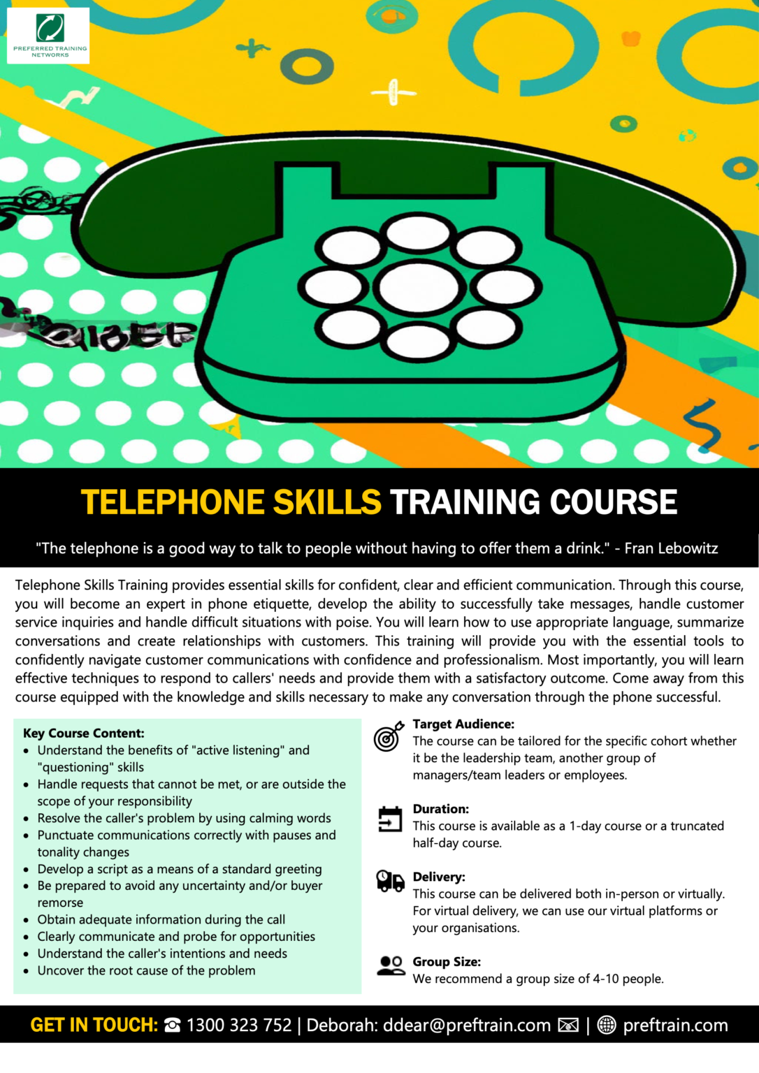Telephone skills training courses help set the tone for people making or receiving a call. Some workplaces have the call answering/receiving system down pat. Everyone knows what to do. It makes sense to have well-trained phone operators. The most popular question we get asked in the course, “how do you keep a caller calm?”