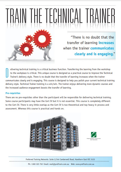 There are no prerequisites other than the participant will be responsible for delivering technical training. Some course participants may have the Cert IV, but it is not essential. This course is completely different to the Cert IV. There is very little overlap, as the Cert IV is too theoretical and top-heavy in process and assessment. Whereas this course is practical and hands on.
