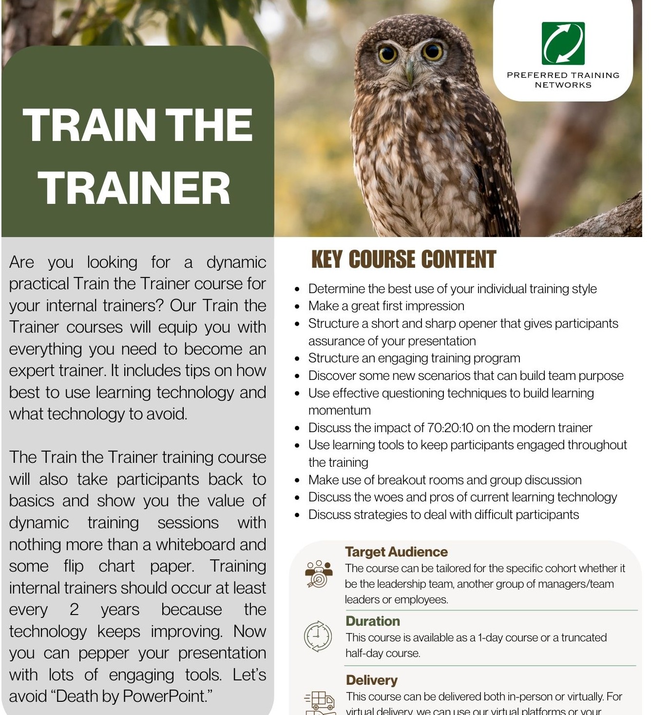Are you looking for a dynamic practical train the trainer course for your internal trainers? Our Train the Trainer courses will equip you with everything you need to become an expert trainer. It includes tips on how best to use learning technology and what technology to avoid. The train the trainer training course will also take participants back to basics and show you the value of dynamic training sessions with nothing more than a whiteboard and some flip chart paper. Training internal trainers should occur at least every 2 years because the technology keeps improving. Now you can pepper your presentation with lots of engaging tools. Let’s avoid “Death by PowerPoint.”