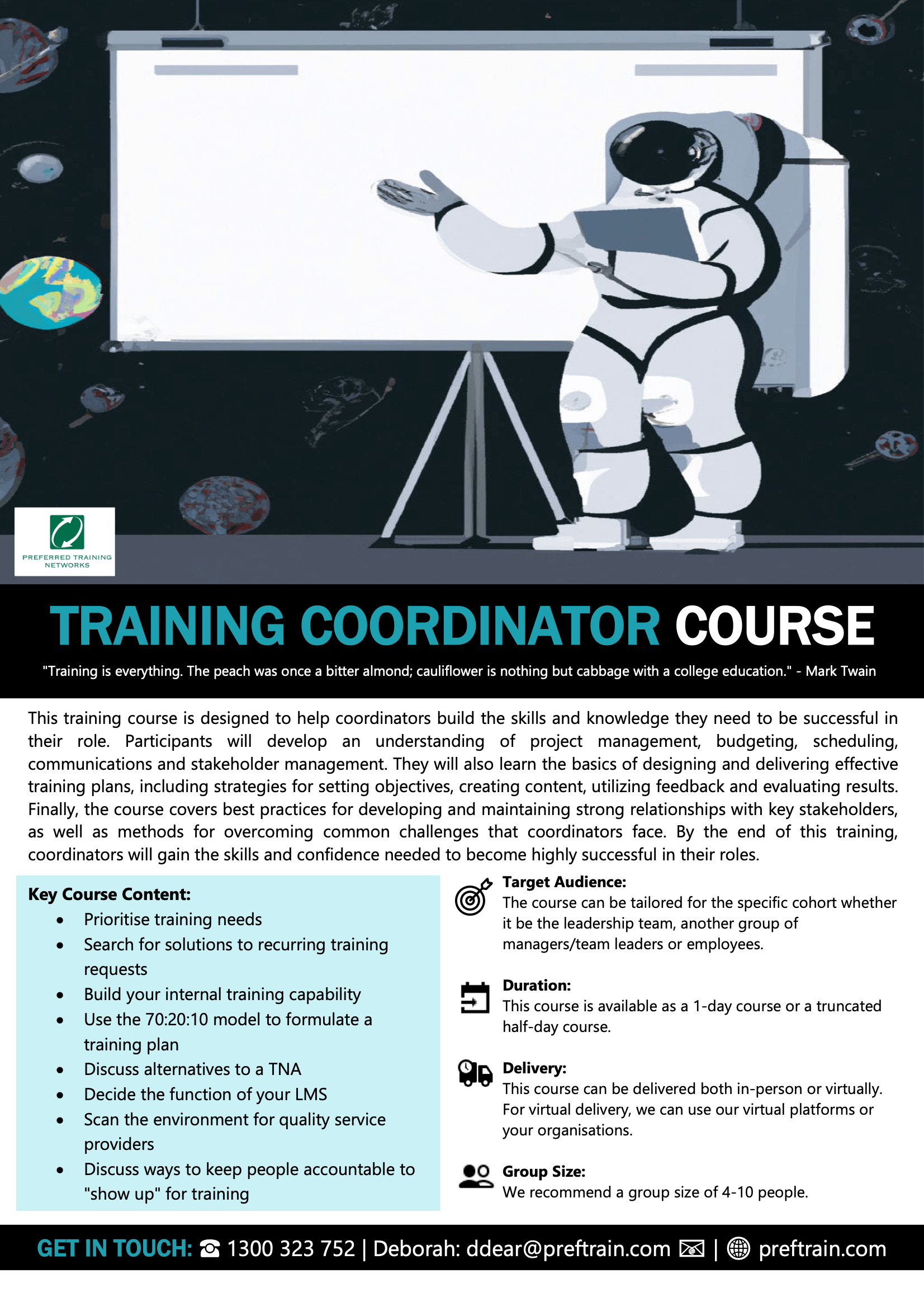 Duration: Each course can be tailored to suit your timeframes.