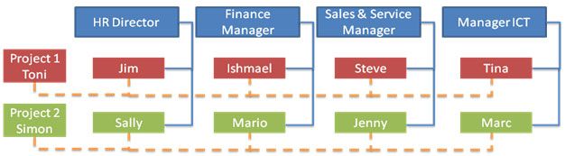 The figure at the below is an example of a basic matrix structure. Across the top are the typical organisational Human Resource, finance Sales & Service and ICT. Down the left hand side are the various projects. Each project has a project leader and is staffed by a people from each of the functional areas. The functional reporting lines are in blue and the project reporting lines in orange.